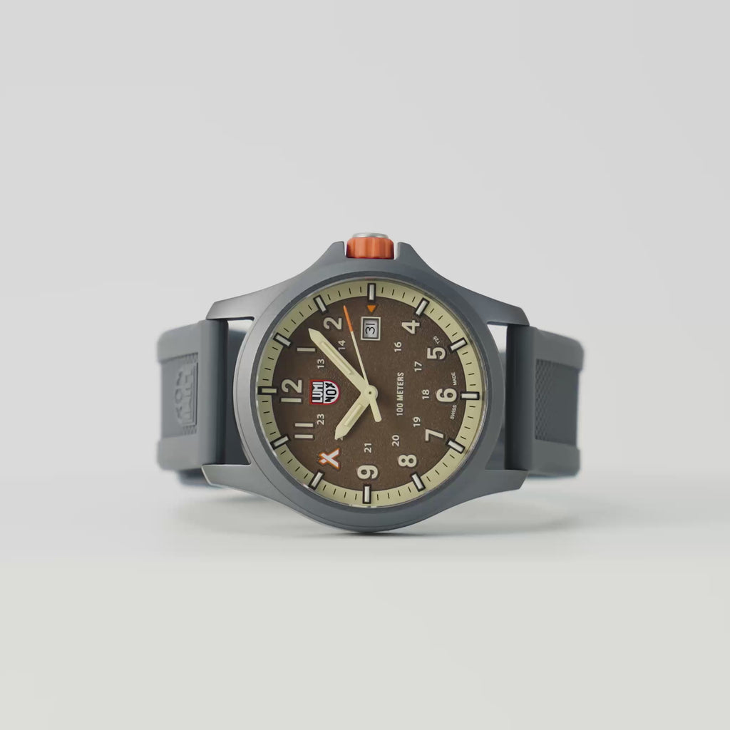 Crafted for long expeditions and inspired by survival legend Bear Grylls, the XB.3716 watch is your ultimate field companion. The sleek 43mm case is made of ultra-lightweight ALUMI-NOX, an aerospace-grade aluminium which offers exceptional strength, anti-corrosion protection, and anti-magnetic precision. The sand-blasted texture of the brown dial boosts readability while a date window offers added functionality. Swiss Made and water-resistant to 100 meters, the watch features a scratch-resistant sapphire crystal, Swiss Quartz movement and the signature Bear Grylls design elements including the orange crown, his iconic logo at 10 o’clock and his Never Give Up mantra engraved on the case back. The Luminox Light Technology with 14 light tubes ensures constant visibility day or night making this a perfect watch for those who love to explore the outdoors.