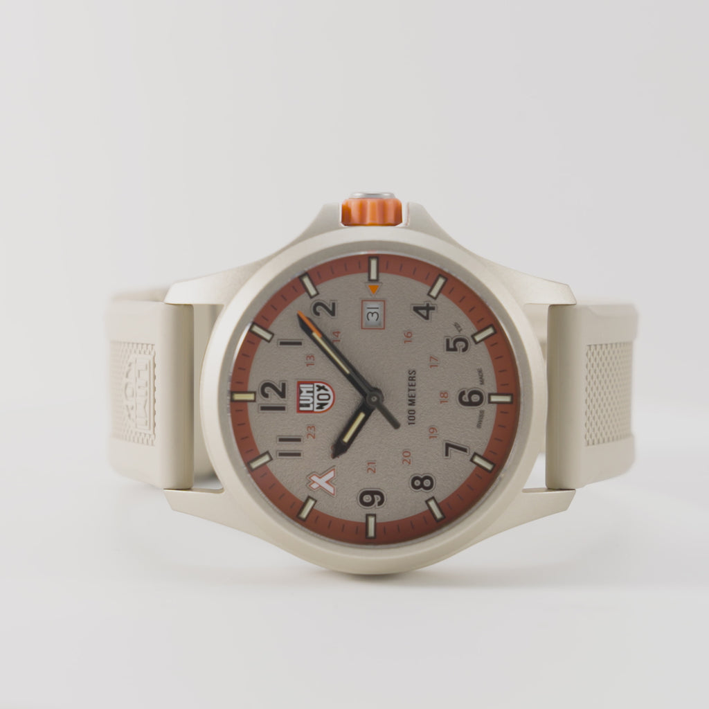 Crafted for long expeditions and inspired by survival legend Bear Grylls, the XB.3717 watch is your ultimate field companion. The sleek 43mm case is made of ultra-lightweight ALUMI-NOX, an aerospace-grade aluminium which offers exceptional strength, anti-corrosion protection, and anti-magnetic precision. The sand-blasted texture of the sand coloured dial boosts readability while a date window offers added functionality. Swiss Made and water-resistant to 100 meters, the watch features a scratch-resistant sapphire crystal, Swiss Quartz movement and the signature Bear Grylls design elements including the orange crown, his iconic logo at 10 o’clock and his Never Give Up mantra engraved on the case back. The Luminox Light Technology with 14 light tubes ensures constant visibility day or night making this a perfect watch for those who love to explore the outdoors.