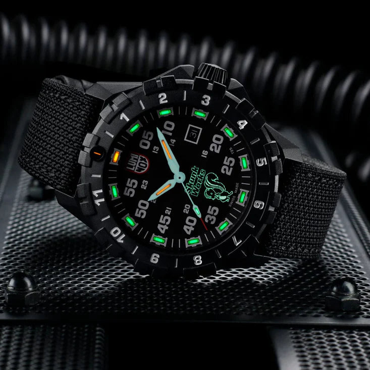 The F-117 NIGHTHAWK® x Skunk Works® Heritage wristwatch is a remarkable interpretation of the aviator's watch. Inspired by the pilots who flew the stealth fighter jets, and approached Luminox almost 25 years ago, this AIR timepiece marries the iconic design with Skunk Works® innovation. The Skunk Works® logo on the dial is barely visible during the day, but at night it remarkably lights up in Super-LumiNova® at 6 o'clock, to pay homage to the top-secret unit's vital role in advanced technology solutions and innovation in U.S aviation. The Skunk Works® and Lockheed Martin® logos are engraved on the case back. With reversed numbers on the bezel and dial so the watch can be read in two different time zones this timepiece becomes a companion not just for Air Force pilots but for everyday adventurers seeking the extraordinary.