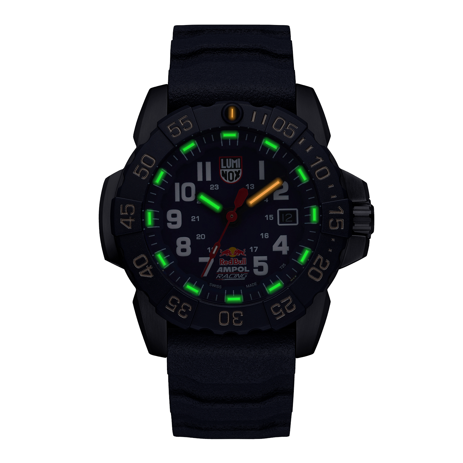 The exclusive Red Bull Ampol Racing branding and accents elevate its bold black dial, complemented by high-contrast white numerals for daytime clarity. When the lights go out, Luminox Light Technology ensures unmatched night visibility – “Always Visible”, self-powered, and guaranteed to glow continuously for up to 25 years.
